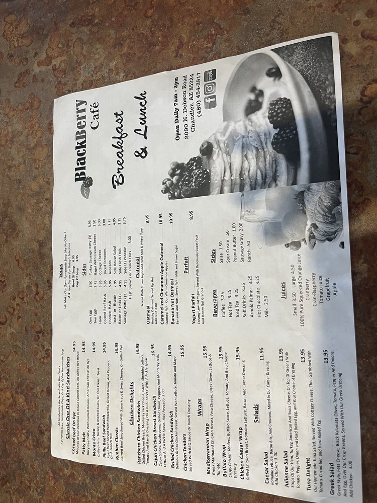 Blackberry Cafe, located in Chandler, Arizona, is a hidden gem offering a diverse menu that caters to all, including vegans and those with gluten-free preferences. With a charming atmosphere and exceptional service, this cafe stands out for its fresh and delicious food. Customers have raved about dishes like the gluten-free pancakes, country fried steak, and the Garden Skillet with perfectly cooked eggs. The staff at Blackberry Cafe are praised for being friendly, efficient, and accommodating, making every visit a memorable experience. With a range of options for breakfast, brunch, and lunch, this cafe is not just a dining spot but a community hub where guests can enjoy a meal in a clean and welcoming environment. Blackberry Cafe truly delivers on both taste and service, making it a must-visit destination for food enthusiasts in the area.